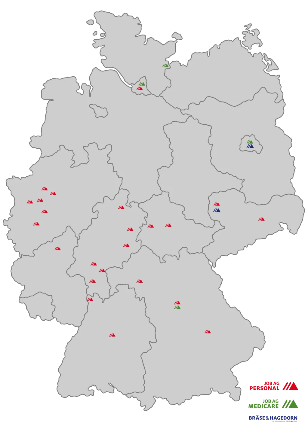 Die JOB AG ist an zahlreichen Standorten in ganz Deutschland vertreten. Als führender Personaldienstleister bieten wir unseren Kunden und Bewerbern eine flächendeckende Präsenz und lokale Expertise.