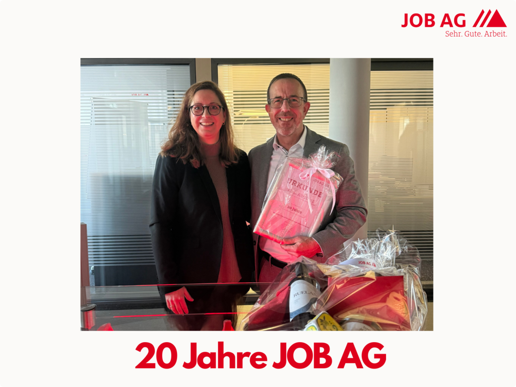 Seine Erfahrung, Loyalität und Verlässlichkeit machen Klaus zu einem wichtigen Anker innerhalb der JOB AG – fachlich wie menschlich. Die JOB AG dankt ihm für 20 Jahre Engagement, Einsatz und Sehr. Gute. Arbeit. und blickt mit Freude auf die weitere gemeinsame Zusammenarbeit.